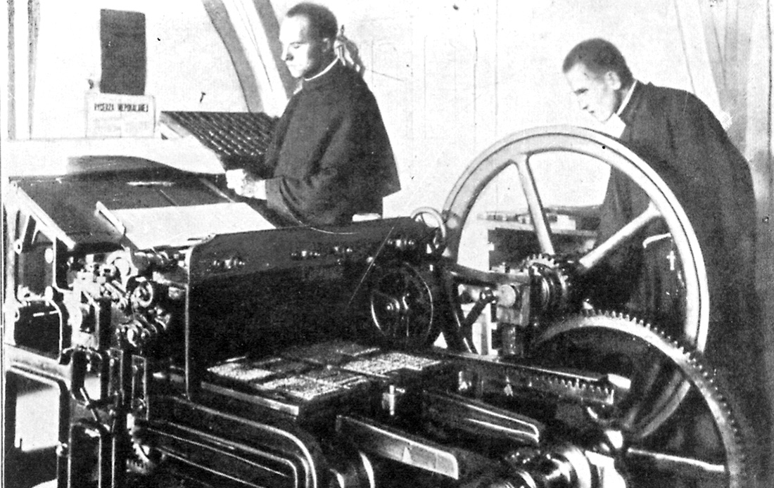 Oto jaką sytuację zastał w drukarni brat Gabriel na drugi dzień po przy­jeździe. Aspirant obracał ręcznie kołem maszyny, brat Albert zsuwał na jej blat arkusze przydeptując prawy pedał, a po drugiej stronie ojciec Kolbe na­ciskał drugi pedał. Bez prądu elektrycznego praca była strasznie męcząca.